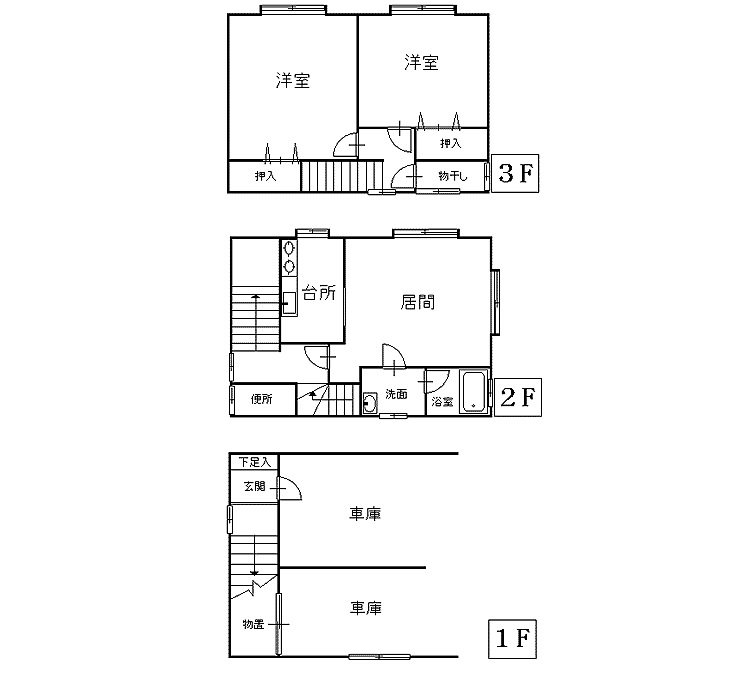 | 間取詳細 | 1階:車庫(2台駐車可) 2階:キッチン、洋室9帖 3階:洋室9帖、7帖、サンルーム | 交通 | ||