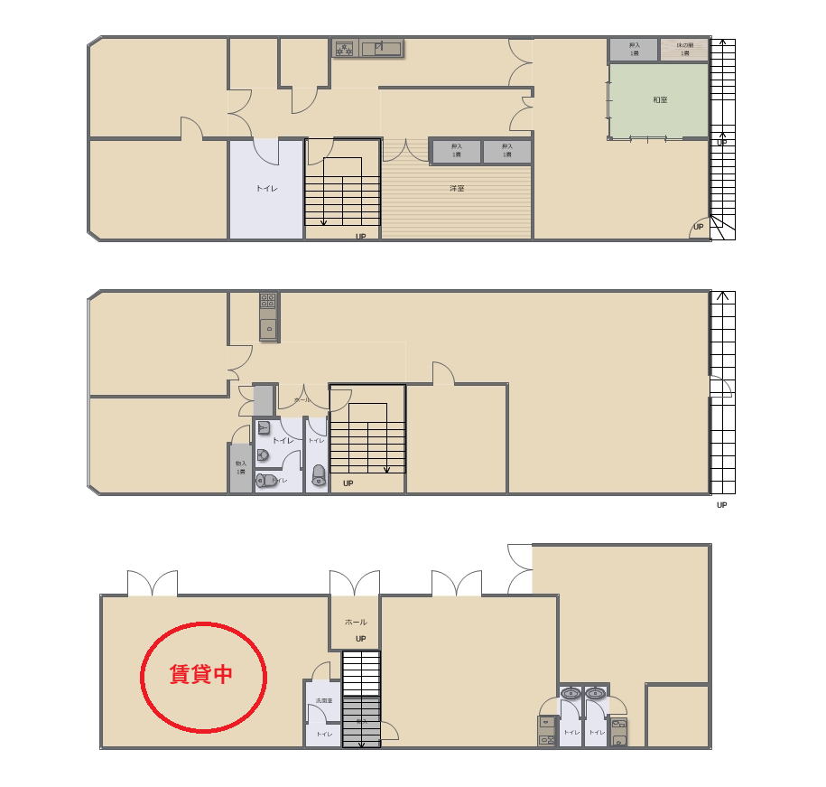 | 備考 | 2階のみ契約の場合、9.9万円(税込)/月、3階のみ契約の場合、8.8万円(税込)/月それぞれ縦列駐車2台付 内装のリフォーム工事・美装につきましては、借主負担となりますので賃料抑えめです。 |
