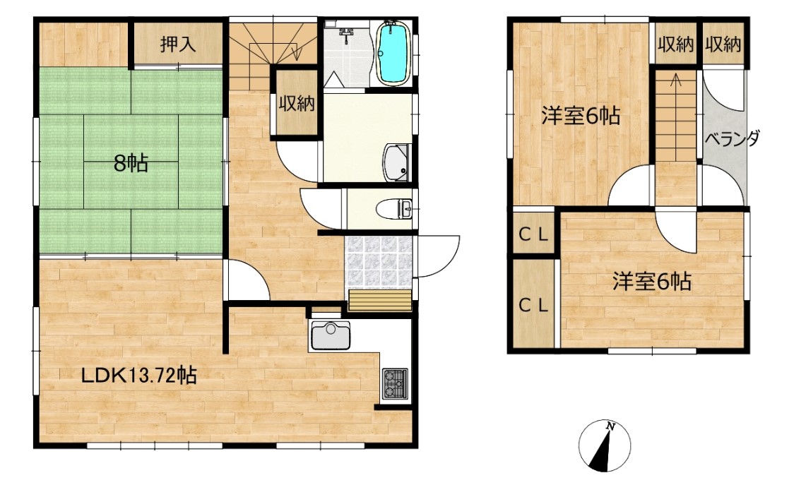 | 間取内訳 | 1階:LDK13.72帖、和8帖 2階:洋6×2、ベランダ | |||