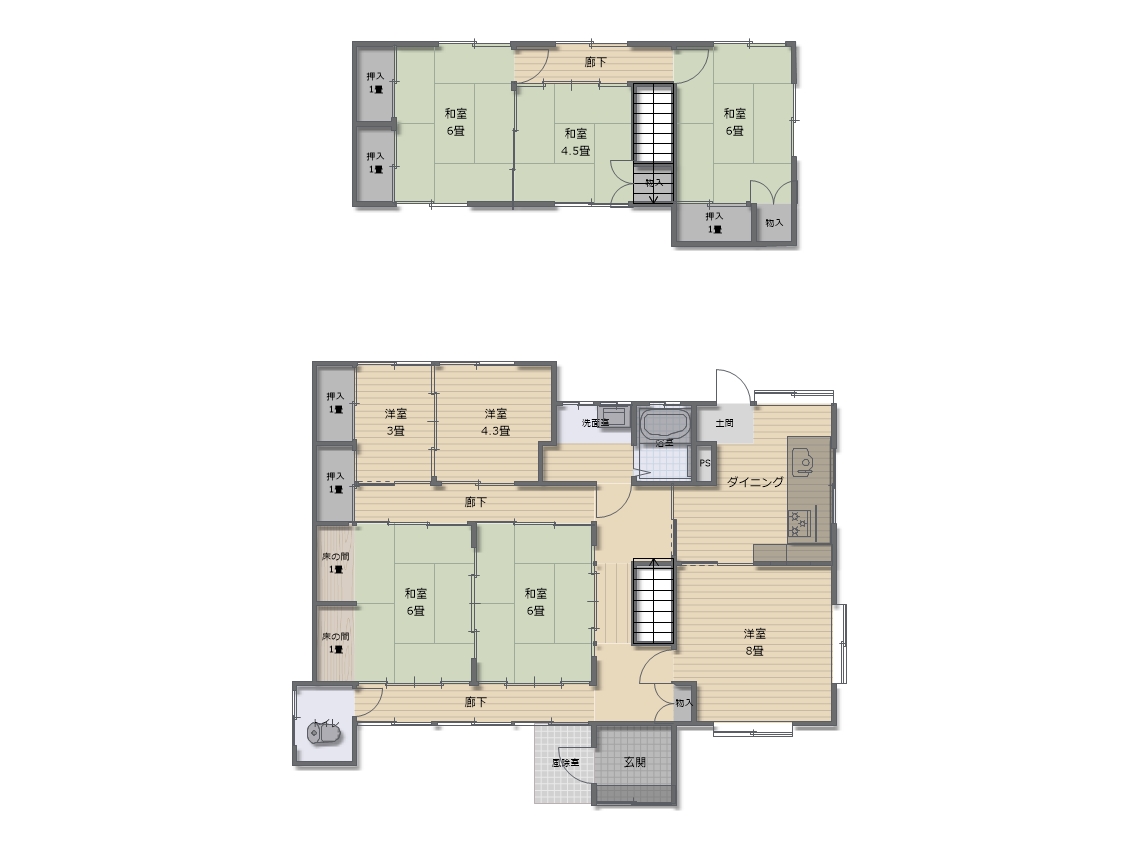 | 間取内訳 | 1階:キッチン・洋室8帖・和室6帖×2・洋室3帖・洋室4.3帖 2階:和室6帖×2・和室4.5帖 | |||