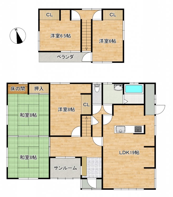 間取内訳 | 1階:LDK19帖、和8帖×2、洋8帖 2階:洋6.5帖、洋6帖 | |||