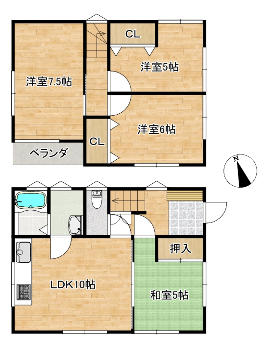 | 間取内訳 | 1階:LDK10帖、和5帖 2階:洋7.5帖、洋6帖、洋5帖 | |||
