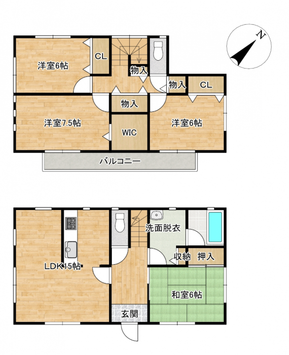 | 間取内訳 | 1階:LDK約15帖、和6帖 2階:洋7.5帖、洋6帖×2 | |||