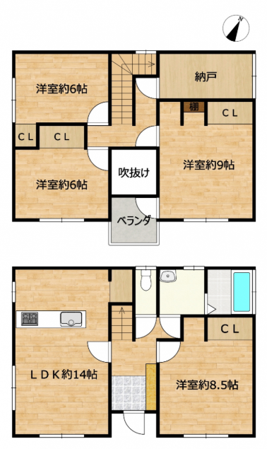 | 間取内訳 | 1階:LDK約14帖、洋約8.5帖 2階:洋9帖、洋6帖×2 | |||