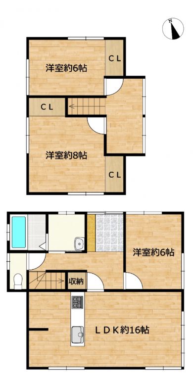| 間取内訳 | 1階:LDK約16帖、洋約6帖 2階:洋8帖、洋6帖 | |||