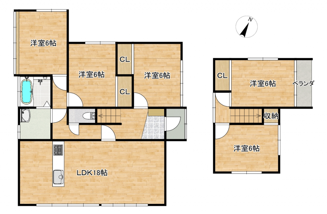 | 間取内訳 | 1階:LDK18帖、洋6帖×3 2階:洋6帖×2 | |||