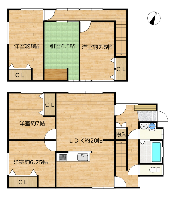 | 間取内訳 | 1階:LDK20帖、洋7帖、洋6.75帖 2階:洋8帖、洋7.5帖、和6.5帖 | |||