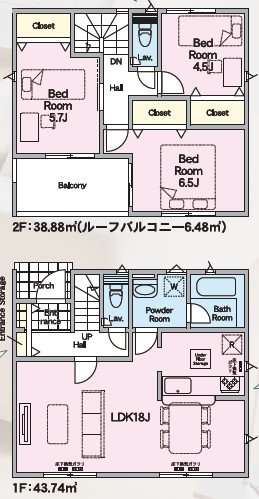 | 間取内訳 | 1階:LDK18 2階:洋5.7・洋6.5・洋4.5 | |||