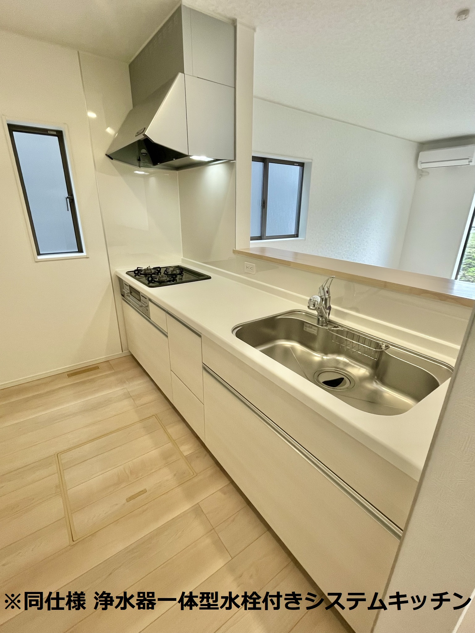 | 備考 | 設備:システムキッチン、浄水器、浴室乾燥機、シャンプードレッサー、洗浄便座、トイレ2か所、モニター付きインターホン、防犯カメラ、人感センサーライト、ディンプルキー、複層ガラス、各室収納スペース、床下収納、24時間換気システム、火災警報器(報知器)、エアコン ・TVアンテナ・網戸・居室照明・カーテンレール等は付きません。 ・敷地内に電柱及び支線が入る場合があります。 ・図面と現況が異なる場合は現況優先にてご了承願います。 ・外構工事、水道加入金等は販売価格に含まれています。 |