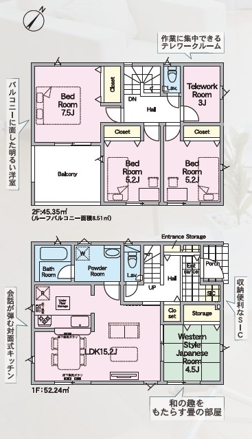 | 間取内訳 | 1階:LDK15.2帖、和4.5帖 2階:洋7.5帖、洋5.2帖×2、テレワークルーム3帖 | |||