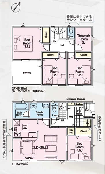 | 間取内訳 | 1階:LDK15.2帖、洋4.5帖 2階:洋7.5帖、洋5.2帖×2、テレワークルーム3帖 | |||